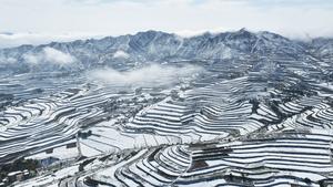 (251018) -- BEIJING, 18 octubre, 2025 (Xinhua) -- Vista aérea tomada con un dron el 17 de octubre de 2025 de campos en terrazas cubiertos de nieve, en el poblado Chenjing, en el condado de Yongjing, en la provincia de Gansu, en el noroeste de China. (Xinhua/Shi Youdong) (jg) (da)