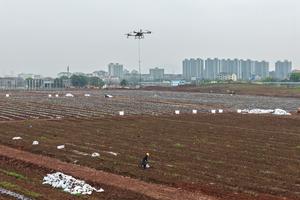 (260330) -- BEIJING, 30 marzo, 2026 (Xinhua) -- Imagen tomada con un dron el 27 de marzo de 2026 de un dron ayudando a un agricultor a repartir sacos de fertilizante en los campos, en el distrito de Jindong, en la ciudad de Jinhua, en la provincia de Zhejiang, en el este de China. (Xinhua/Shi Kuanbing) (oa) (ah) (ce)