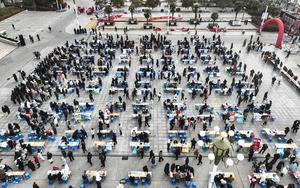 (250214) -- BEIJING, 14 febrero, 2025 (Xinhua) -- Vista aérea tomada con un dron el 12 de febrero de 2025 de buscadores de trabajo asistiendo a una feria de empleo celebrada en la ciudad de Jiyuan, en la provincia de Henan, en el centro de China. Un total de 22.000 ferias de empleo y eventos públicos de reclutamiento se celebraron en todo el país desde mediados de enero hasta el 11 de febrero, ofreciendo unos 15 millones de vacantes a los solicitantes de trabajo. (Xinhua/Miao Qiunao) (oa) (ra) (vf)