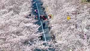 (250325) — BEIJING, 25 marzo, 2025 (Xinhua) — Vista aérea tomada con un dron el 24 de marzo de 2025 de turistas observando los cerezos en flor en la calle Jianzhen, en Yangzhou, en la provincia de Jiangsu, en el este de China. Tras el equinoccio de primavera, el cuarto período solar en el calendario lunar chino, que este año cayó el 20 de marzo, las temperaturas suben y las flores están en plena floración en todo el país, atrayendo a las personas a salir al aire libre para disfrutar de la primavera. (Xinhua/Qi Liguang) (jg) (ra) (ce)