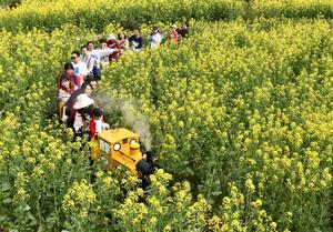 (250325) -- BEIJING, 25 marzo, 2025 (Xinhua) -- Imagen del 23 de marzo de 2025 de turistas viajando en un tren turístico a través de un mar de flores de colza en un punto escénico, en el distrito de Wuyuan, en la provincia de Jiangxi, en el este de China. Tras el equinoccio de primavera, el cuarto período solar en el calendario lunar chino, que este año cayó el 20 de marzo, las temperaturas suben y las flores están en plena floración en todo el país, atrayendo a las personas a salir al aire libre para disfrutar de la primavera. (Xinhua/Li Zongxian) (jg) (ra) (ce)