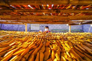 (251119) -- BEIJING, 19 noviembre, 2025 (Xinhua) -- Una agricultora seca batatas cortadas en rodajas en un patio, en la ciudad de Zunhua, en la provincia de Hebei, en el norte de China, el 19 de noviembre de 2025. (Xinhua/Liu Mancang) (jg) (da) (ce)