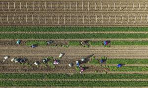 (251119) -- BEIJING, 19 noviembre, 2025 (Xinhua) -- Vista aérea tomada con un dron el 18 de noviembre de 2025 de agricultoras cosechando cilantro, en el distrito de Yutian de Tangshan, en la provincia de Hebei, en el norte de China. (Xinhua/Liu Mancang) (jg) (da) (ce)