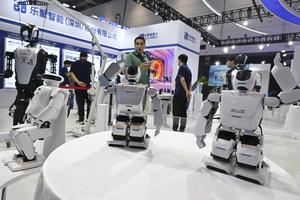 (250919) -- QINGDAO, 19 septiembre, 2025 (Xinhua) -- Robots son vistos en la Exposición Internacional de Electrónica de Consumo de China (CICE, por sus siglas en inglés) 2025, en Qingdao, en la provincia de Shandong, en el este de China, el 19 de septiembre de 2025. Con el tema "La Inteligencia Conecta a Todos, La Inteligencia Artificial Empodera al Futuro", la CICE de este año comenzó aquí el viernes, mostrando tecnologías de vanguardia y productos innovadores. (Xinhua/Li Ziheng) (rtg) (ra) (vf)
