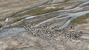 (250911) -- HAIXI, 11 septiembre, 2025 (Xinhua) -- Vista aérea tomada con un dron el 9 de septiembre de 2025 de pastores dirigiendo a su ganado fuera de la pastura de verano, en el distrito de Dulan, en la prefectura autónoma mongola-tibetana de Haixi, en la provincia de Qinghai, en el noroeste de China. Recientemente, los pastores en el distrito de Dulan han comenzado su migración otoño-invierno. (Xinhua/Qi Zhiyue) (rtg) (ra) (vf)