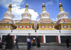 (250408) -- YUSHU, 8 abril, 2025 (Xinhua) -- Imagen del 6 de abril de 2025 de personas orando mientras rodean el montículo de piedras mani de Jiana, en la ciudad de Yushu, en la prefectura autónoma tibetana de Yushu, en la provincia de Qinghai, en el noroeste de China. El montículo de piedras mani de Jiana es una reliquia cultural bajo protección nacional. Está compuesto por miles de millones de piedras mani y es utilizado por los habitantes cuando sostienen ruedas de oración y murmuran la oración de seis sílabas para cumplir su ritual diario. (Xinhua/Qi Zhiyue) (jg) (ra) (vf)