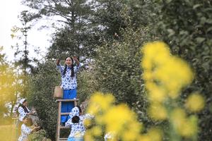 (250404) -- BEIJING, 4 abril, 2025 (Xinhua) -- Imagen del 2 de abril de 2025 de aldeanas recogiendo hojas de té de antiguos árboles de té, en el distrito autónomo tujia y miao de Xiushan, en la municipalidad de Chongqing, en el suroeste de China. Los agricultores estaban ocupados cosechando hojas de té poco antes del Festival Qingming para producir el té Mingqian (literalmente "pre-Qingming"), que se elabora con los primeros brotes de té en primavera y se considera de alta calidad. (Xinhua/Hu Cheng) (oa) (da) (ce)