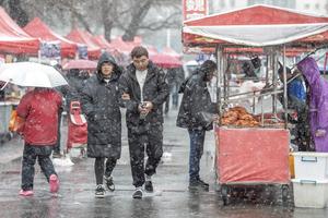 (250412) -- BEIJING, 12 abril, 2025 (Xinhua) -- Personas visitan un mercado en medio de la nieve, en Qiqihar, en la provincia de Heilongjiang, en el noreste de China, el 12 de abril de 2025. Muchas partes del norte de China están experimentando vientos huracanados y descensos de temperatura el sábado. (Xinhua/Wang Yonggang) (oa) (da)
