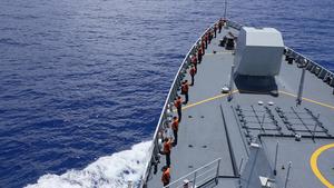 (250820) -- A BORDO DEL DESTRUCTOR SHAOXING, 20 agosto, 2025 (Xinhua) -- Marineros chinos permanecen en cubierta durante una ceremonia de separación de flotas, en una zona marítima del Pacífico occidental, el 20 de agosto de 2025. Las flotas navales china y rusa concluyeron el miércoles por la mañana un patrullaje conjunto de 15 días tras separarse en una zona marítima del Pacífico occidental. La operación de patrulla se realizó después de un ejercicio conjunto de las dos Armadas en los espacios marítimo y aéreo cerca de Vladivostok, Rusia, que tuvo lugar del 1 al 5 de agosto. (Xinhua/Duan Zhenjun) (da) (ce)