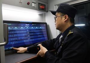 (251117) -- XI'AN, 17 noviembre, 2025 (Xinhua) -- Un empleado trabaja en un tren de prueba de la línea de ferrocarril de alta velocidad que conecta Xi'an con Yan'an, en la provincia de Shaanxi, en el noroeste de China, el 17 de noviembre de 2025. La línea ferroviaria de alta velocidad que conecta Xi'an, capital de la provincia de Shaanxi, en el noroeste de China, con Yan'an, en el norte de Shaanxi, ha entrado en su fase de pruebas, lo que supone un importante avance hacia su plena operatividad. Las pruebas comenzaron el lunes por la mañana con la partida del tren de prueba 55302 desde Xi'an hacia Yan'an, dando paso a las simulaciones operativas tras la fase conjunta de puesta a punto y pruebas. (Xinhua/Jia Zhiwei) (rtg) (ah) (vf)