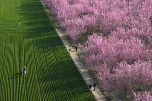 (250319) -- XI'AN, 19 marzo, 2025 (Xinhua) -- Vista aérea tomada con un dron el 18 de marzo de 2025 de turistas disfrutando las flores de ciruelo en una plantación, en el distrito de Huyi de Xi'an, en la provincia de Shaanxi, en el noroeste de China. (Xinhua/Shao Rui) (ah) (vf)