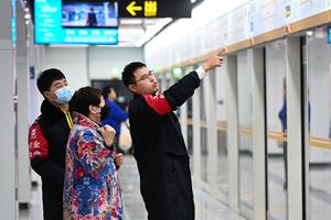 (241227) -- XI'AN, 27 diciembre, 2024 (Xinhua) -- Imagen del 26 de diciembre de 2024 de un trabajador guiando a una pasajera en una estación de la línea 8 del metro, en Xi'an, en la provincia de Shaanxi, en el noroeste de China. La recién inaugurada línea 8, la primera línea circular de metro con 37 estaciones en Xi'an, elevó la longitud del sistema de metro de la ciudad a más de 400 kilómetros. (Xinhua/Zou Jingyi) (oa) (ra) (vf)