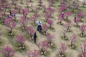 (250425) -- XI'AN, 25 abril, 2025 (Xinhua) -- Vista aérea tomada por un dron el 13 de marzo de 2025 de personas disfrutando de flores de ciruelo, en el distrito de Chang'an de Xi'an, en la provincia de Shaanxi, en el noroeste de China. (Xinhua/Shao Rui) (oa) (ra) (ce)