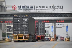 (251116) -- XI'AN, 16 noviembre, 2025 (Xinhua) -- Imagen del 14 de noviembre de 2025 de un camión llegando a la Estación Portuaria Internacional de Xi'an, en Xi'an, en la provincia de Shaanxi, en el noroeste de China. Inaugurado en 2013, el tren de carga China-Europa en Xi'an se ha mantenido a la cabeza del país en aspectos clave como el número de trenes, el volumen de carga y la proporción de contenedores cargados durante muchos años. Actualmente, la Estación Portuaria Internacional de Xi'an opera 59 rutas ferroviarias, con una capacidad anual de 5,4 millones de TEU (unidades equivalentes a veinte pies). Proyectos como el puerto de Kazajistán-Xi'an se han completado y puesto en funcionamiento, facilitando el comercio y el transporte con Europa y Asia, e impulsando la transformación de la ciudad en un moderno centro logístico y de comercio internacional. (Xinhua/Shao Rui) (rtg) (da)