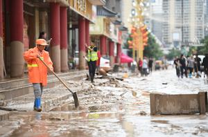 (250726) -- YAN'AN, 26 julio, 2025 (Xinhua) -- Un trabajador de saneamiento limpia una calle tras una inundación, en el distrito de Wuqi de la ciudad de Yan'an, en la provincia de Shaanxi, en el noroeste de China, el 26 de julio de 2025. Las fuertes lluvias han afectado al distrito de Wuqi desde el jueves, provocando graves inundaciones. Las autoridades locales han activado la respuesta de emergencia de nivel III para la prevención y el control de las inundaciones, con recursos dedicados para el socorro y la restauración en caso de desastre. La mayoría de las calles principales de Wuqi han sido despejadas, el suministro de agua se ha reanudado en gran medida, y hasta el sábado no se habían recibido informes de víctimas, según la autoridad del distrito a cargo de la respuesta a las inundaciones. (Xinhua/Zhang Bowen) (oa) (da)