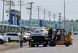 (250528) -- WEIFANG, 28 mayo, 2025 (Xinhua) -- Trabajadores transportan un automóvil dañado en el sitio de la explosión de una empresa química, en la ciudad de Gaomi, en la provincia de Shandong, en el este de China, el 28 de mayo de 2025. La Comisión de Seguridad Laboral del Consejo de Estado de China decidió supervisar la investigación sobre la explosión en el taller de una empresa química en la provincia de Shandong, en el este de China, informó el miércoles el Ministerio de Gestión de Emergencias. El fatal incidente, con cinco muertos confirmados y seis aún desaparecidos, ocurrió el martes en la ciudad de Gaomi. (Xinhua/Li Ziheng) (jg) (da) (vf)