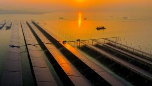 (251120) -- JINAN, 20 noviembre, 2025 (Xinhua) -- Vista aérea tomada con un dron del 16 de noviembre de 2025 de un proyecto de generación de energía fotovoltaica marina, en las aguas de Aoshanwan, en el distrito de Jimo, en la ciudad de Qingdao, en la provincia de Shandong, en el este de China. En 2020, China anunció que se esforzaría por alcanzar el pico de emisiones de dióxido de carbono antes de 2030 y la neutralidad de carbono antes de 2060. (Xinhua/Liang Xiaopeng) (da) (ra) (ce)