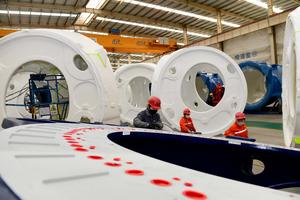 (251120) -- JINAN, 20 noviembre, 2025 (Xinhua) -- Imagen del 19 de noviembre de 2025 de trabajadores pintando un núcleo de un generador de energía eólica en un taller de pintura del parque industrial de fabricación de equipos de energía eólica, en el distrito de Huimin, en la provincia de Shandong, en el este de China. En 2020, China anunció que se esforzaría por alcanzar el pico de emisiones de dióxido de carbono antes de 2030 y la neutralidad de carbono antes de 2060. (Xinhua/Guo Xulei) (da) (ra) (ce)
