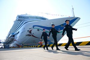 (250406) -- QINGDAO, 6 abril, 2025 (Xinhua) -- Oficiales de inmigración pasan frente al Adora Magic City en la Terminal Internacional de Cruceros de Qingdao, en Qingdao, en la provincia de Shandong, en el este de China, el 6 de abril de 2025. Como el primer gran crucero construido en China, el Adora Magic City se embarcó en su viaje comercial inaugural el 1 de enero de 2024. Esta vez, el crucero hizo su debut en Qingdao, que es su primera aparición en una ciudad portuaria china que no sea su puerto base en Shanghai, y partirá hacia Jeju en República de Corea y Fukuoka en Japón. (Xinhua/Li Ziheng) (rtg) (ah)