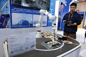 (251016) -- QINGDAO, 16 octubre, 2025 (Xinhua) -- Un expositor opera un robot de caligrafía en la décima Exposición Internacional de los Derechos de Autor de China, en Qingdao, en la provincia de Shandong, en el este de China, el 16 de octubre de 2025. Con el tema "La Inteligencia Digital Lidera el Futuro, los Derechos de Autor Promueven el Desarrollo Innovador", la décima Exposición Internacional de los Derechos de Autor de China y el Foro Internacional de los Derechos de Autor 2025 se inauguraron el jueves en Qingdao. (Xinhua/Li Ziheng) (da) (ra) (vf)