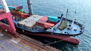 (251030) — QINGDAO, 30 octubre, 2025 (Xinhua) — Imagen tomada con dron del 29 de octubre de 2025 de un buque de carga con destino al puerto de Incheon, en República de Corea, en el puerto de Qingdao, en Qingdao, en la provincia de Shandong, en el este de China. Como centro de comercio marítimo, el puerto de Qingdao ha aprovechado su proximidad a Japón y República de Corea mientras se esfuerza por construir una red logística que abarque los principales puertos de ambos países. (Xinhua/Li Ziheng) (da) (ra) (ce)