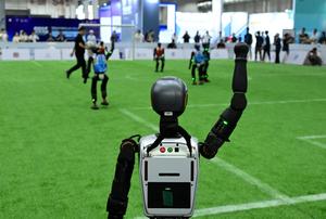 (250909) -- QINGDAO, 9 septiembre, 2025 (Xinhua) -- Imagen del 8 de septiembre de 2025 de un robot animando a sus compañeros de equipo durante un partido de fútbol de la Copa Mundial de Robots (RoboCup) del Torneo Invitacional Asia-Pacífico de Qingdao, en Qingdao, en la provincia de Shandong, en el este de China. (Xinhua/Li Ziheng) (oa) (ah) (ce)