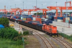 (250829) -- QINGDAO, 29 agosto, 2025 (Xinhua) -- Imagen tomada con un dron el 27 de agosto de 2025 de un tren de carga llegando al centro de transporte multimodal de la Zona de Demostración de Cooperación Económica y Comercial Local China-OCS (Organización de Cooperación de Shanghai) (SCODA), en Qingdao, en la provincia de Shandong, en el este de China. De acuerdo con las estadísticas de las aduanas, el valor comercial de la zona de demostración con otros países miembros de la OCS durante los primeros siete meses de este año alcanzó los 53,26 billones de yuanes (unos 7,47 billones de dólares estadounidenses), lo que supone un aumento interanual del 26,1 por ciento. (Xinhua/Li Ziheng) (oa) (ra) (vf)