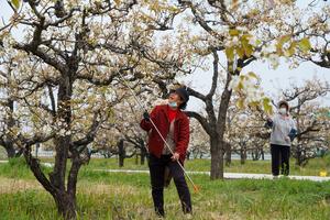 (260404) -- TENGZHOU, 4 abril, 2026 (Xinhua) -- Imagen del 3 de abril de 2026 de agricultoras polinizando perales en un huerto de peras, en el poblado de Chaihudian de la ciudad de Tengzhou, en la provincia de Shandong, en el este de China. Los perales en casi 10.000 mu (aproximadamente 667 hectáreas) de huertos de peras en el poblado de Chaihudian de Tengzhou han entrado en plena floración recientemente, atrayendo a turistas para disfrutar de las flores. (Xinhua/Zhu Zheng) (jg) (da)