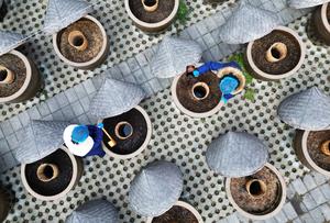 (260129) -- TENGZHOU, 29 enero, 2026 (Xinhua) -- Imagen tomada con un dron el 29 de enero de 2026 de trabajadores revolviendo salsa de soya en fermentación en una cervecería tradicional, en Tengzhou, en la provincia de Shandong, en el este de China. (Xinhua/Li Zhijun) (da) (ra) (vf)