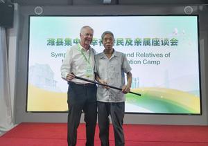 (250828) -- WEIFANG, 28 agosto, 2025 (Xinhua) -- Imagen del 17 de agosto de 2025 de Han Chongbin (d), cuyo padre alguna vez ayudó a expatriados en el campo de concentración de Weihsien, entregando un bastón de regalo a Charlie Stanley, en un simposio en el Museo del Sitio del Campo de Concentración de Civiles del Oeste de Weihsien, en Weifang, en la provincia de Shandong, en el este de China. Weifang, alguna vez conocido como Weixian o Weihsien, albergaba el "Patio del Camino Feliz", un recinto construido por estadounidenses en 1882. El campo fue utilizado para detener a más de 2.000 expatriados, entre ellos más de 300 niños, procedentes de Estados Unidos, Gran Bretaña, Canadá y otros países. (Xinhua/Museo del Sitio del Campo de Concentración de Civiles del Oeste de Weihsien) (rtg) (ra) (vf)