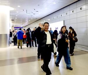 (260311) -- SHANGHAI, 11 marzo, 2026 (Xinhua) -- Imagen del 10 de marzo de 2026 de un compatriota taiwanés que quedo varado en Medio Oriente saludando a su llegada al Aeropuerto Internacional Pudong de Shanghai, en Shanghai, en el este de China. Más de 70 compatriotas taiwaneses que se encontraban varados en Medio Oriente regresaron a Taiwan el martes, tras pasar por Shanghai. (Xinhua/Fang Zhe) (ah) (ra) (ce)