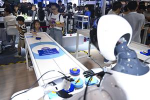 (250729) -- SHANGHAI, 29 julio, 2025 (Xinhua) -- Una niña juega al curling con un robot en la Conferencia Mundial de IA (WAIC, por sus siglas en inglés) 2025, en Shanghai, en el este de China, el 29 de julio de 2025. La multitud de robots inteligentes en exhibición ha atraído mucha atención en la WAIC 2025 en Shanghai. Además de los que son versados en caligrafía y combate marcial, también hay una gama de robots expertos en tareas prácticas en diversos escenarios laborales y de vida. (Xinhua/Chen Haoming) (jg) (ra) (ce)
