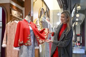 (260216) -- SHANGHAI, 16 febrero, 2026 (Xinhua) -- Imagen del 6 de febrero de 2026 de Aleksandra Antonenko seleccionando trajes tradicionales chinos, en el centro comercial Jardín Yuyuan, en Shanghai, en el este de China. Aleksandra Antonenko se mudó de Rusia para realizar su doctorado en la Universidad Jiao Tong de Shanghai en 2022. También comenzó a mostrar el encanto de la vida cotidiana en China al mundo con videos cortos. (Xinhua/Chen Haoming) (rtg) (ah) (vf)