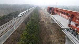 (250223) — HEFEI, 23 febrero, 2025 (Xinhua) — Vista aérea tomada con un dron el 23 de febrero de 2025 del sitio de instalación de vigas cajón de un ferrocarril de alta velocidad que une Shanghai, Nanjing de la provincia de Jiangsu y Hefei de la provincia de Anhui, en el este de China. El ferrocarril es parte de la red ferroviaria de alta velocidad de China que se centra en ocho líneas verticales principales que unen el norte y el sur y ocho líneas horizontales que conectan el este y el oeste. (Xinhua/Zhang Biying) (rtg) (ah)