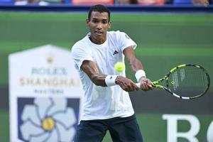 (251010) -- SHANGHAI, 10 octubre, 2025 (Xinhua) -- Felix Auger-Aliassime, de Canadá, devuelve la pelota a Arthur Rinderknech, de Francia, durante el partido de cuartos de final de individuales masculinos en el torneo de tenis Masters de Shanghai del ATP World Tour, en Shanghai, en el este de China, el 10 de octubre de 2025. (Xinhua/Chen Haoming) (jg) (da) (vf)