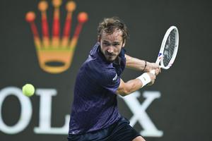 (251011) -- SHANGHAI, 11 octubre, 2025 (Xinhua) -- Daniil Medvedev devuelve la pelota durante la semifinal de individuales masculinos entre Arthur Rinderknech, de Francia, y Daniil Medvedev, de Rusia, en el torneo de tenis Masters de Shanghai del ATP World Tour, en Shanghai, en el este de China, el 11 de octubre de 2025. (Xinhua/Chen Haoming) (rtg) (da)