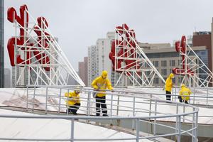 (250730) -- SHANGHAI, 30 julio, 2025 (Xinhua) -- Trabajadores verifican la estabilidad de las barandillas del techo de la Estación del Ferrocarril de Shanghai, en Shanghai, en el este de China, el 30 de julio de 2025. Co-may, el octavo tifón de este año, tocó tierra por segunda vez en la municipalidad de Shanghai, en el este de China, el miércoles por la tarde después de tocar tierra en la provincia de Zhejiang la madrugada del miércoles, según el observatorio meteorológico central de Shanghai. (Xinhua/Wang Xiang) (ah) (ra) (ce)
