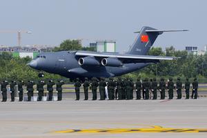 (250912) -- SHENYANG, 12 septiembre, 2025 (Xinhua) -- Un avión de transporte Y-20 de la Fuerza Aérea del Ejército Popular de Liberación de China que transporta los restos de los mártires de los Voluntarios del Pueblo Chino (VPCh) aterriza en el Aeropuerto Internacional Taoxian de Shenyang, en la provincia de Liaoning, en el noreste de China, el 12 de septiembre de 2025. Los restos de 30 soldados caídos de los VPCh que perdieron la vida durante la Guerra de Resistencia contra la Agresión de Estados Unidos y de Ayuda a Corea (1950-1953) fueron repatriados a China el viernes desde la República de Corea. (Xinhua/Yang Pan) (jg) (da) (vf)