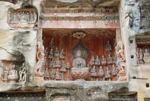 (250221) -- BAZHONG, 21 febrero, 2025 (Xinhua) -- Imagen del 19 de febrero de 2025 de estatuas budistas en el punto escénico de las grutas de Nankan, en el distrito de Bazhou de la ciudad de Bazhong, en la provincia de Sichuan, en el suroeste de China. Las grutas de Nankan, conocidas por sus 179 grutas talladas que albergan más de 2.700 estatuas budistas pintadas, son una atracción turística en la ciudad de Bazhong. La talla de las grutas comenzó en la dinastía Sui (581-618). Las estatuas aquí son ricas en contenido, exquisitas en forma, brillantes en color y están bien conservadas. (Xinhua/Zhang Yawen) (jg) (da) (ce)