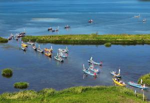 (250916) -- LIANGSHAN, 16 septiembre, 2025 (Xinhua) -- Vista aérea tomada con un dron el 16 de septiembre de 2025 de residentes saliendo de un muelle para dar una vuelta al lago en bote, en el distrito de Yanyuan de la prefectura autónoma yi de Liangshan, en la provincia de Sichuan, en el suroeste de China. La vuelta a la montaña y al lago es una importante costumbre popular del pueblo mosuo que vive cerca del lago Lugu. (Xinhua/Jiang Hongjing) (jg) (ra) (vf)
