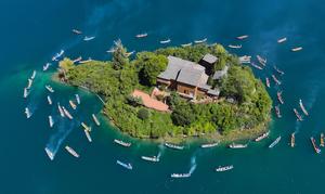(250916) -- LIANGSHAN, 16 septiembre, 2025 (Xinhua) -- Vista aérea tomada con un dron el 16 de septiembre de 2025 de personas navegando alrededor de una isla mientras dan vuelta al lago en bote, en el distrito de Yanyuan de la prefectura autónoma yi de Liangshan, en la provincia de Sichuan, en el suroeste de China. La vuelta a la montaña y al lago es una importante costumbre popular del pueblo mosuo que vive cerca del lago Lugu. (Xinhua/Zeng Chengxu) (jg) (vf)