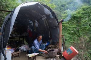 (250523) -- CHENGDU, 23 mayo, 2025 (Xinhua) -- Imagen del 21 de mayo de 2025 de Xu Tingyou cocinando su comida en un refugio en la base de educación científica popular del mono dorado de nariz chata de Pingwu Sichuan, en el distrito de Pingwu, en la ciudad de Mianyang de la provincia de Sichuan, en el suroeste de China. Se contrató a aldeanos locales como guardabosques en la reserva para proteger mejor a los monos dorados de nariz chata de Sichuan. (Xinhua/Jiang Hongjing) (jg) (da) (ce)