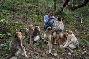 (250523) -- CHENGDU, 23 mayo, 2025 (Xinhua) -- Imagen del 21 de mayo de 2025 de Xu Tingyou interactuando con monos dorados de nariz chata de Sichuan en la base de educación científica popular del mono dorado de nariz chata de Pingwu Sichuan, en el distrito de Pingwu, en la ciudad de Mianyang de la provincia de Sichuan, en el suroeste de China. Se contrató a aldeanos locales como guardabosques en la reserva para proteger mejor a los monos dorados de nariz chata de Sichuan. (Xinhua/Jiang Hongjing) (jg) (da) (ce)
