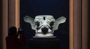 (250127) -- CHENGDU, 27 enero, 2025 (Xinhua) -- Imagen del 18 de diciembre de 2024 de una visitante observando una máscara de bronce exhibida en el nuevo edificio del Museo Sanxingdui, en la ciudad de Guanghan, en la provincia de Sichuan, en el suroeste de China. Descubiertas a finales de la década de 1920, las ruinas de Sanxingdui son consideradas uno de los hallazgos arqueológicos más importantes del mundo en el siglo XX. Extendiéndose por un área de 12 kilómetros cuadrados, se cree que son restos del Reino Shu, que data de hace unos 4.500 a 3.000 años. (Xinhua/Cai Yang) (rtg) (ah) (vf)