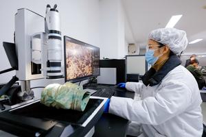 (250127) -- CHENGDU, 27 enero, 2025 (Xinhua) -- Imagen del 18 de diciembre de 2024 de una restauradora observando los detalles de la superficie de una máscara de bronce a través de un microscopio de ultra profundidad de campo en el Museo Sanxingdui, en la ciudad de Guanghan, en la provincia de Sichuan, en el suroeste de China. Descubiertas a finales de la década de 1920, las ruinas de Sanxingdui son consideradas uno de los hallazgos arqueológicos más importantes del mundo en el siglo XX. Extendiéndose por un área de 12 kilómetros cuadrados, se cree que son restos del Reino Shu, que data de hace unos 4.500 a 3.000 años. (Xinhua/Shen Bohan) (rtg) (ah) (vf)