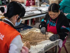 (250425) -- CHENGDU, 25 abril, 2025 (Xinhua) -- Imagen del 8 de abril de 2025 de trabajadoras clasificando muestras de flotación, en Ziyang, en la provincia de Sichuan, en el suroeste de China. China reveló el jueves el listado de los 10 hallazgos arqueológicos más importantes de 2024, entre los descubrimientos se encuentran el sitio paleolítico de Mengxihe, en Sichuan. El sitio paleolítico de Mengxihe reveló un asentamiento paleolítico que data de entre 60.000 y 80.000 años de antigüedad. Los arqueólogos consideran que ofrece evidencia nueva y sistemática que podría ayudar a desentrañar los orígenes del Homo sapiens en el este de Asia. (Xinhua/Xue Chen) (oa) (ra) (vf)