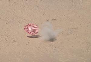 (250430) -- SITIO DE ATERRIZAJE DONGFENG, 30 abril, 2025 (Xinhua) -- La cápsula de retorno de la nave espacial tripulada Shenzhou-19, que transporta a los astronautas Cai Xuzhe, Song Lingdong y Wang Haoze, toca tierra en el sitio de aterrizaje Dongfeng, en la región autónoma de Mongolia Interior, en el norte de China, el 30 de abril de 2025. Los tres astronautas se encuentran en buen estado de salud, según la Agencia de Vuelos Espaciales Tripulados de China. (Xinhua/Li Xin) (jg) (da) (ce)