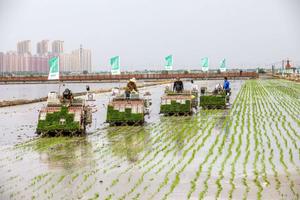 (250612) — TIANJIN, 12 junio, 2025 (Xinhua) — Imagen del 25 de mayo de 2025 de agricultores utilizando trasplantadoras para trasplantar plántulas de arroz en una granja de demostración, en el distrito de Xiqing de Tianjin, en el norte de China. Desde campañas de concientización pública hasta reformas en la industria, China está experimentando una transformación ecológica en su forma de cultivar, preparar y consumir alimentos. Además, una ley de seguridad alimentaria, implementada en 2023, incluye disposiciones para promover la conservación de granos, reforzando la base legal para las iniciativas nacionales contra el desperdicio. (Xinhua) (jg) (da) (ce)