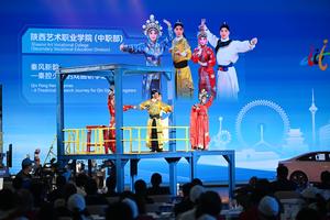 (251114) -- TIANJIN, 14 noviembre, 2025 (Xinhua) -- Concursantes del Colegio Vocacional de Arte de Shaanxi (División de Educación Vocacional Secundaria) compiten durante la Competencia Mundial de Habilidades de Colegios Vocacionales 2025, en Tianjin, en el norte de China, el 14 de noviembre de 2025. Seis equipos participaron aquí el viernes en la final de esta competencia y la Universidad de Tecnología Vocacional de Jinhua obtuvo el campeonato. (Xinhua/Zhao Zishuo) (oa) (da)