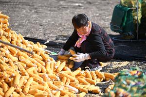 (251021) -- TIANJIN, 21 octubre, 2025 (Xinhua) -- Una agricultora clasifica maíz, en el municipio de Xiawotou del distrito de Jizhou, en Tianjin, en el norte de China, el 21 de octubre de 2025. (Xinhua/Li Ran) (oa) (ah) (ce)